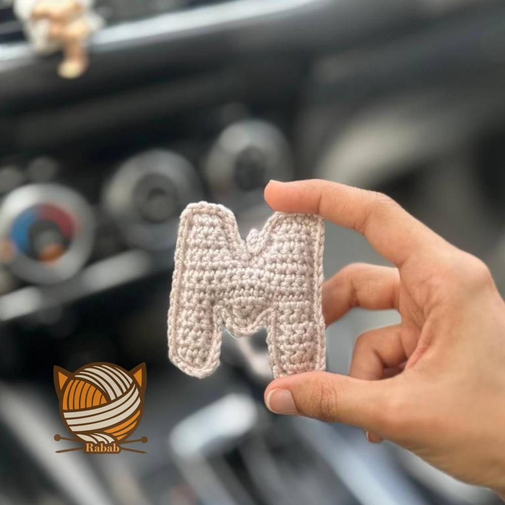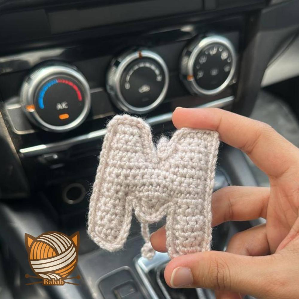 تعليقة يدويّة من الكروشيه على شكل حرف "M"، بتصميم بسيط وأنيق، مثالية لتزيين مراية السيارة أو تقديمها كهدية رمزية تعبّر عن شخصك أو اسم تحبه.