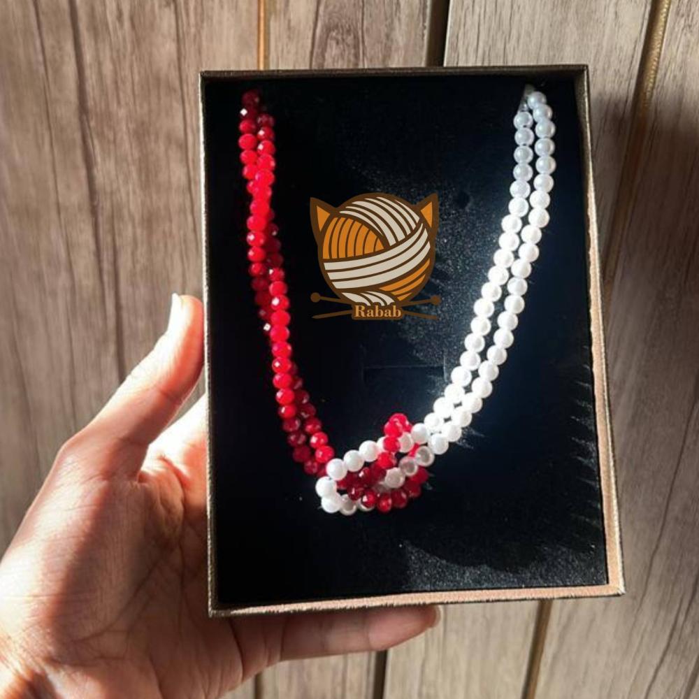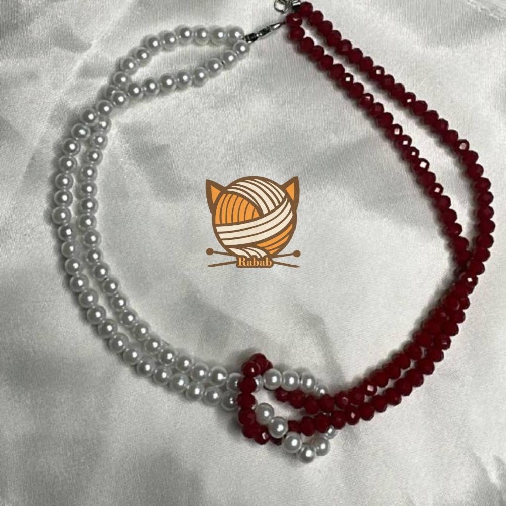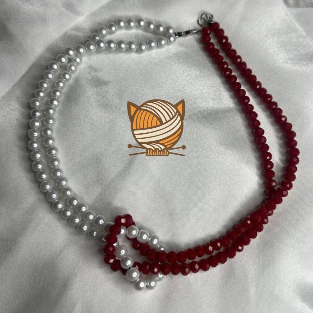 قلادة مصنوعة يدويًا من خرز لامع بلوني الأحمر الجريء والأبيض النقي، بتصميم بسيط وأنيق يضفي لمسة فريدة على أي إطلالة.